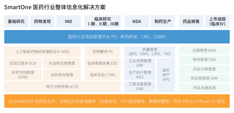 我們為全球的生物醫藥公司提供醫藥行業從研發到生產的整體信息化解決方案,基于公司自主研發產品“一智通SmartOne”。幫助生物醫藥公司實現數字化轉型,降低成本、保障品質、提高效率。
